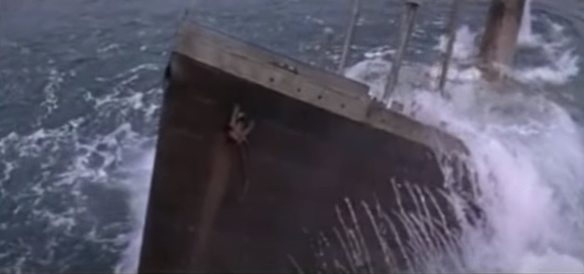 | O Titanic saindo das profundezas do oceano Atlântico no filme O Resgate do Titanic(Raise the Titanic) |