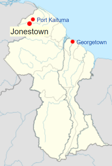 | Localização de Jonestown, na Guiana |