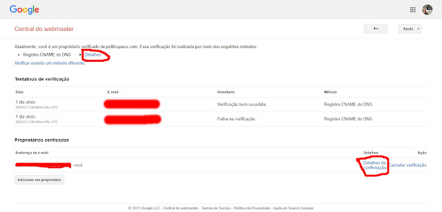 Depois clique sobre o domínio que você quer saber o CNAME ou em “Detalhes da verificação”, na página que abrirá clique em “Detalhes” ou em “Detalhes da confirmação”, vai aparecer o seu segundo CNAME. Lembrando que o primeiro CNAME é sempre “www” e “ghs.google.com”. É só você colocar esses dois CNAMEs lá nas configurações de DNS do seu provedor de domínios. É só isso, espero ter ajudado.