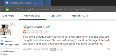 Você já deve ter recebido e-mail ou visto anúncios do site AnastasiaDating, ele se define como um site criado para conectar homens da América do Norte com mulheres do Leste Europeu. No entanto, existem muitas suspeitas sobre esse suposto site de relacionamento, acredita-se que ele seja uma fraude, que ele e muitos outros sites do tipo pagam mulheres para conversarem com os homens, se passando por candidatas a relacionamento, sendo o site uma fraude, chamados na internet de SCAM. É o que diz por exemplo o autor deste cometário no SiteJabber, um site de avaliações: