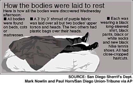 Eles alugaram uma mansão em Rancho Santa Fe, San Diego, Califórnia, pagando $7.000 por mês e no dia 26 de março de 1997 Applewhite e outros 38 membros da seita foram encontrados mortos na casa. Os corpos de muitos já estava em decomposição. Apenas Rio DiAngelo/Richard Ford não cometeu suicídio.