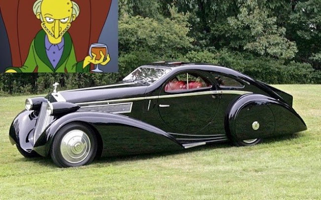 O Phantom I Coupe faz os outros Rolls-Royce se sentirem com vergonha. Construído em 1924, sob encomenda pela empresa belga Jonckheere, o carro passou por várias proprietários, até que em 1991 um japonês o comprou por US$ 1,5 milhões. Em 2004 ele foi adquirido pelo Petersen Museum, na California, que o restaurou por completo. Seu chassis foi inteiramente feito a mão, incluindo as belíssimas portas redondas e o leme estabilizador vertical traseiro, estilo e classe de sobra. Um carro adequado para Montgomery Burns(chefe do Homer aí em cima), que anda com uma nota de um trilhão de dólares na carteira, é arrogante e gosta de humilhar os outros.