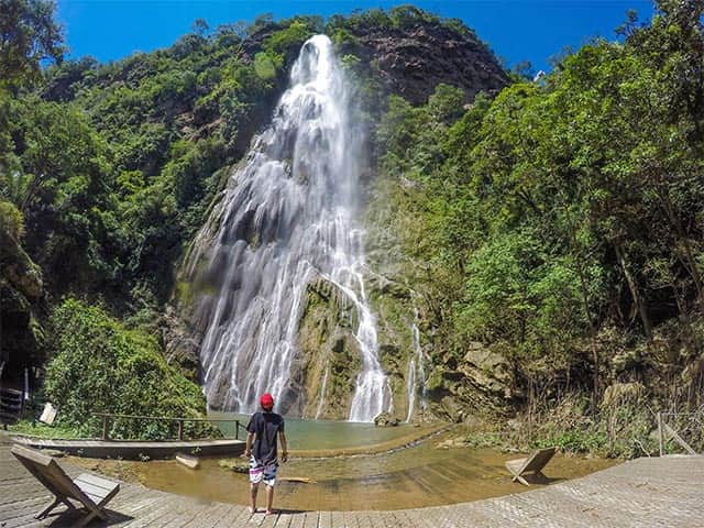 E que tal conhecer a maior cachoeira de Mato Grosso do Sul, a Cachoeira Boca da Onça, ela tem 156 metros de altura, ela fica no cânion do rio Salobra e está localizada no município de Bodoquena.